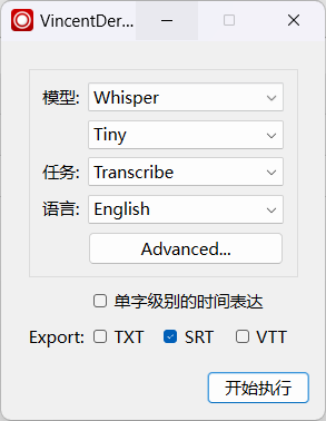 点击+号后选中音频,模型tiny即可,transcribe就是识别,也可以用translate直接翻译。千万不要勾选单字级别的时间表达。一般超过90分钟的视频识别就可能报错,翻译的话更加短些。完全可以用potplayer的字幕实时翻译,还方便切换。